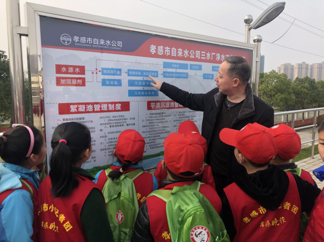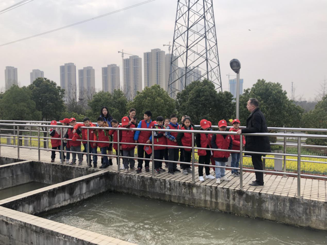 “我們城區(qū)的生活用水來自漢江,大家看看現(xiàn)在水池中水的顏色,我們接著往下參觀……”在公司三水廠工作人員的帶領和介紹下,小記者們看到了處理前的原水。由于他們大多是第一次參觀自來水廠,對每一步工序、每一處管道、每一種儀器都充滿好奇。他們有的在不停追問,仔細探究水處理過程中的每一點細微變化;有的認真做著記錄,若有所思,與家長和同學進行探討。